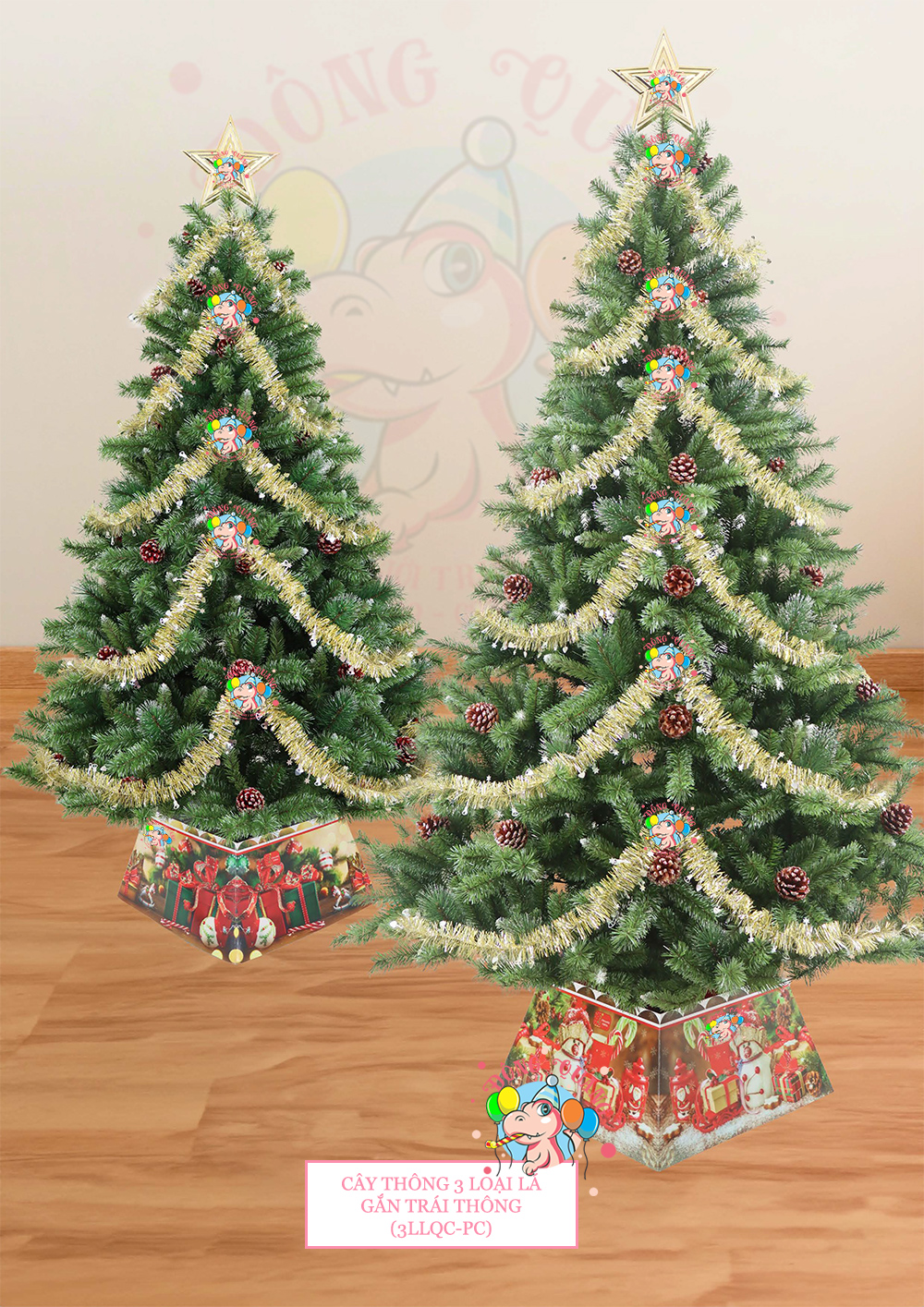 - Chất liệu: lá PVC, sợi cước phun kim tuyến cao cấp, trái thông.