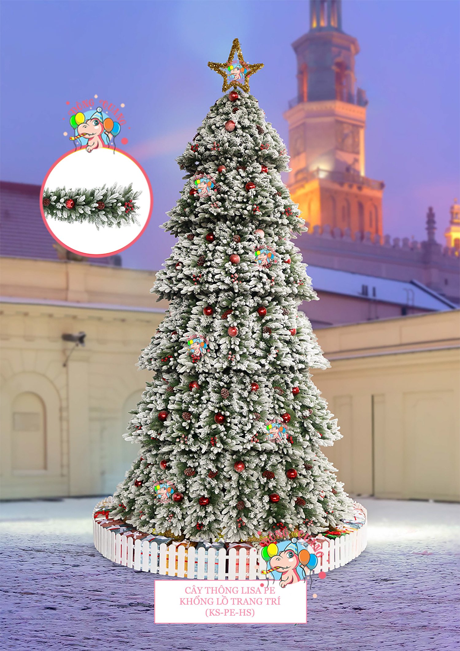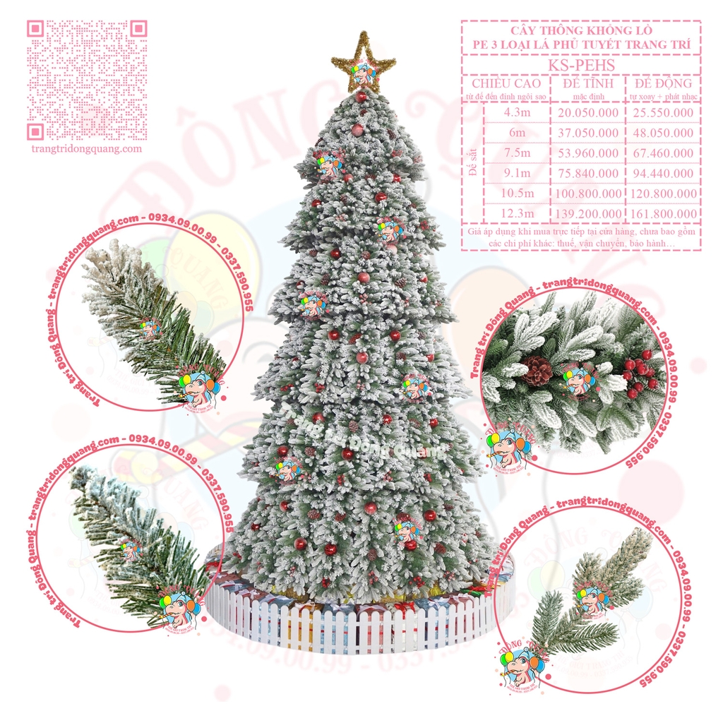 - Chất liệu: 3 loại lá PE, PVC đầu nhọn phủ tuyết cao cấp, châu, trái thông, cherry.