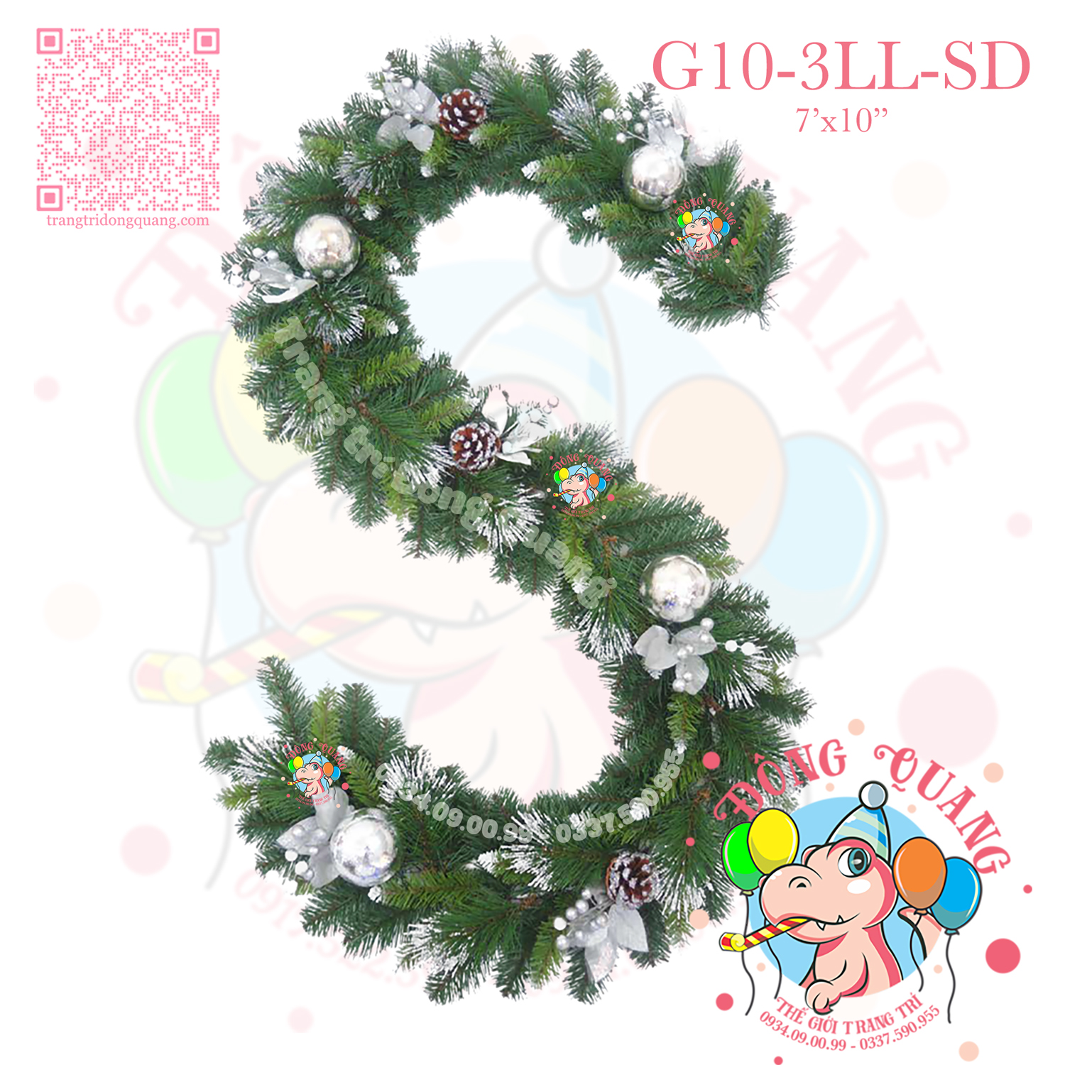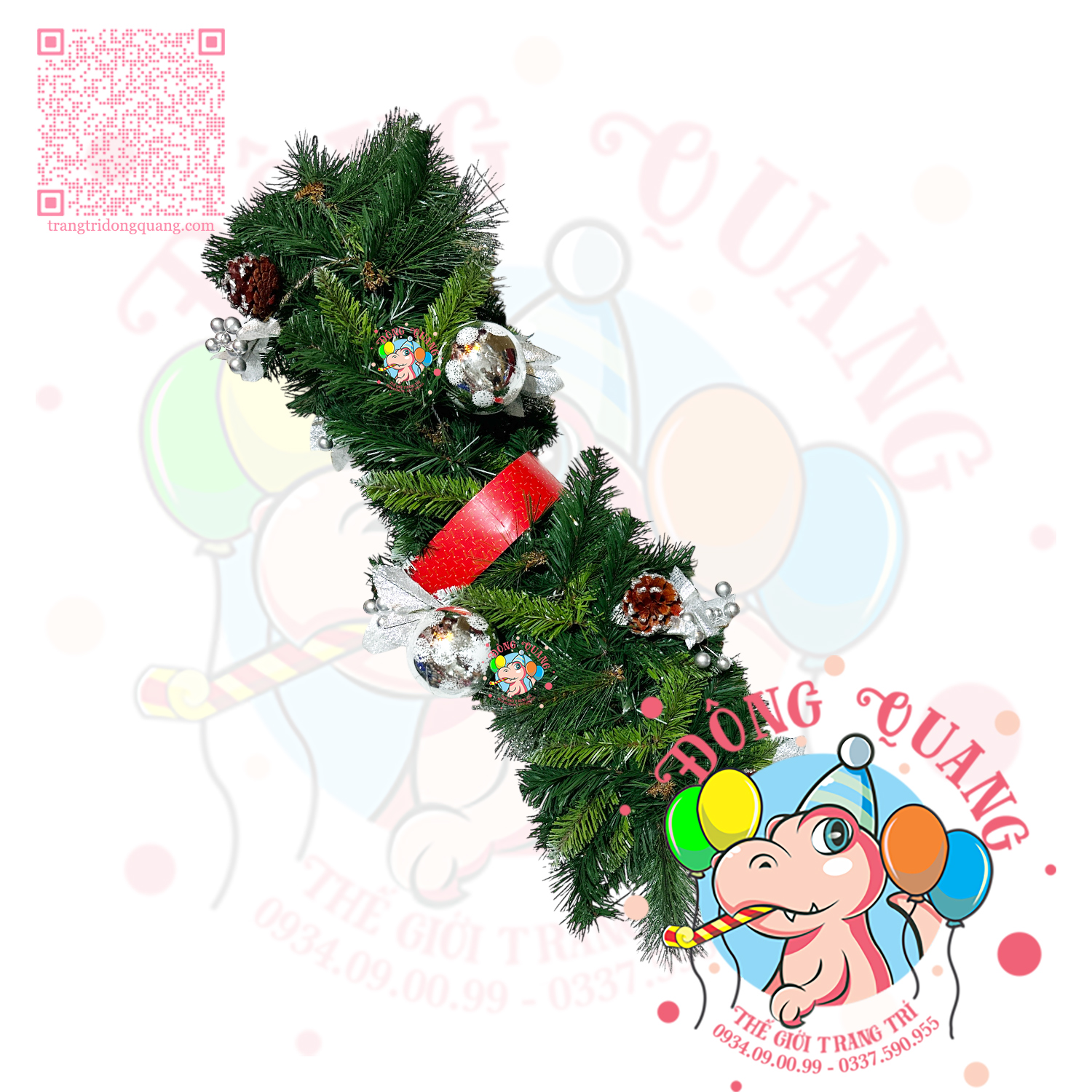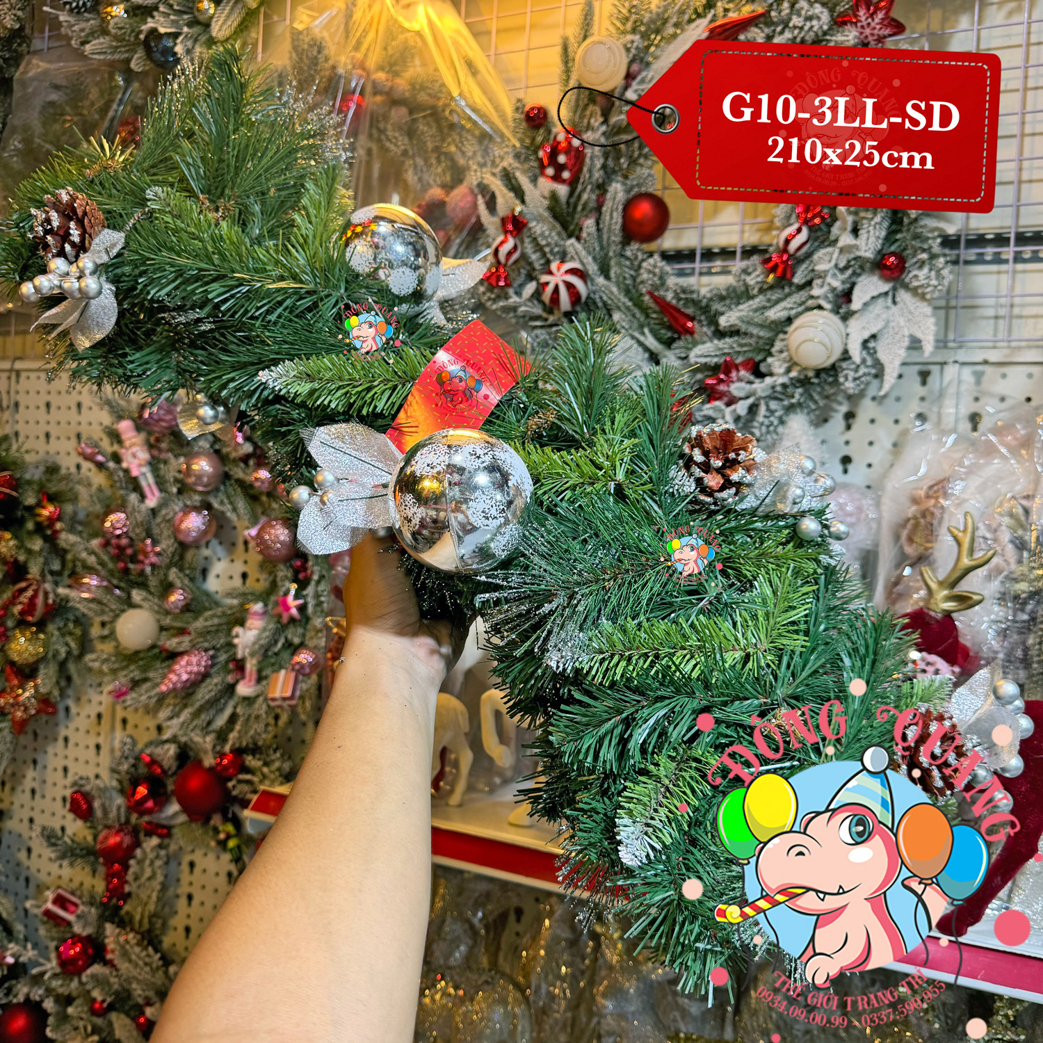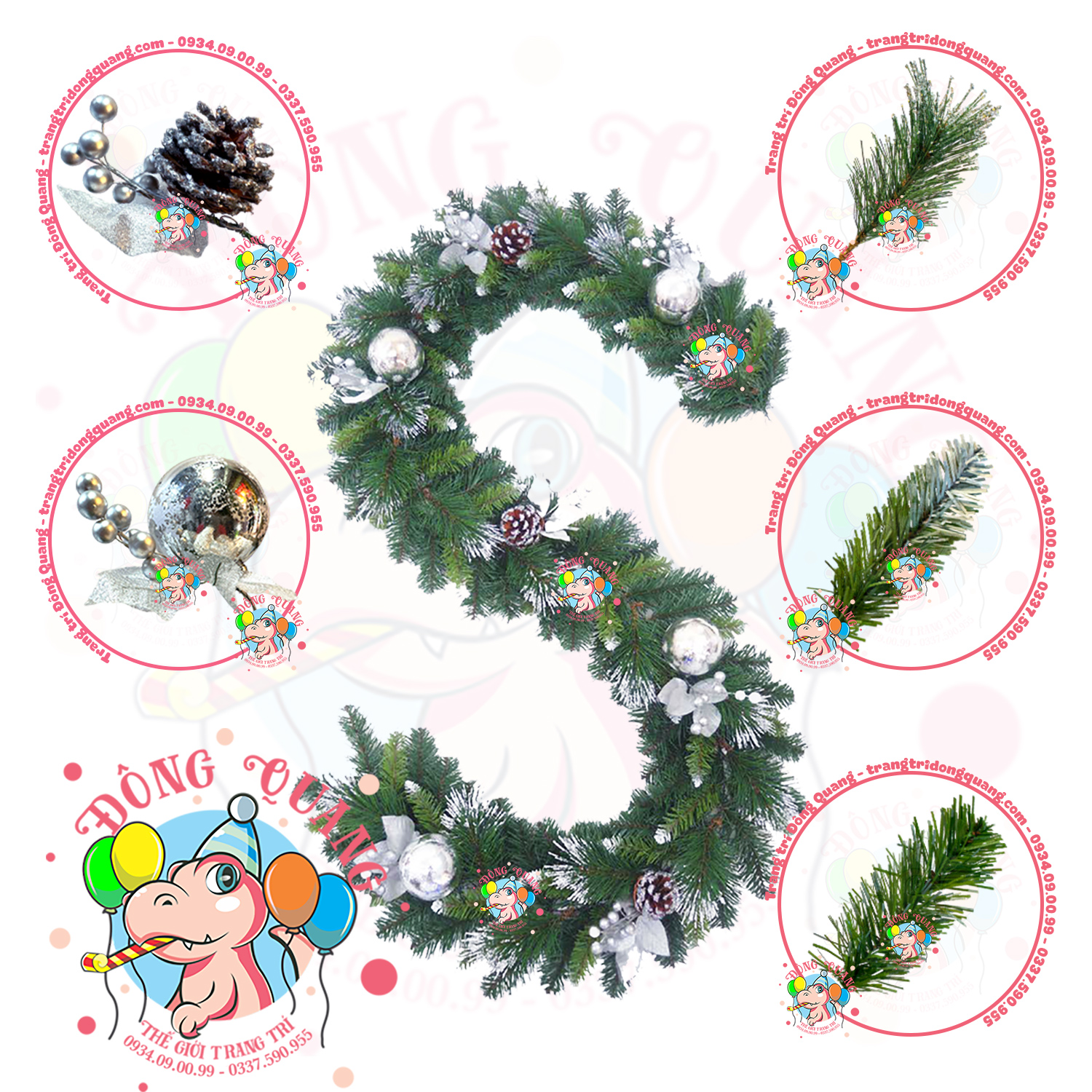 - Chất liệu: 3 loại lá PVC, cước phun kim tuyến bạc, trái thông, trái châu, cherry.