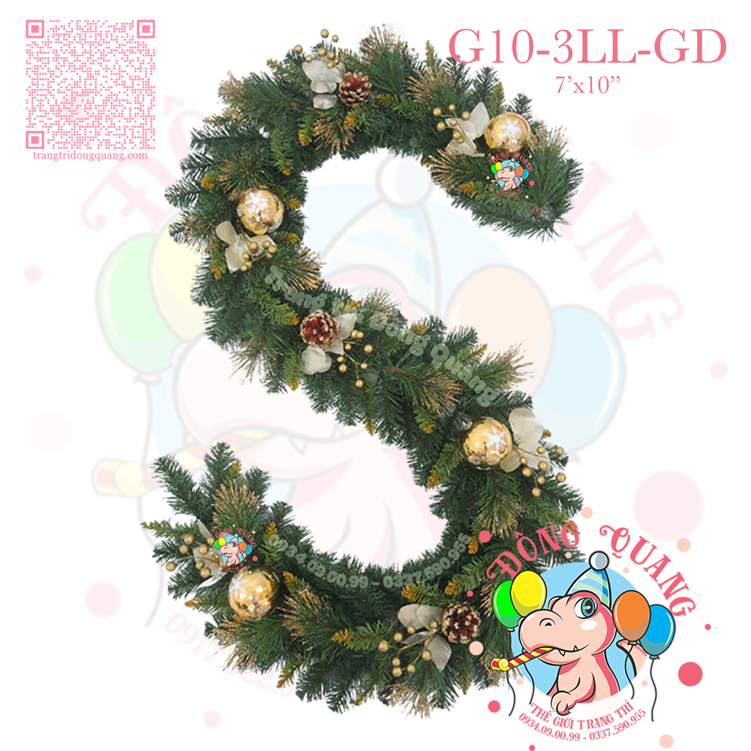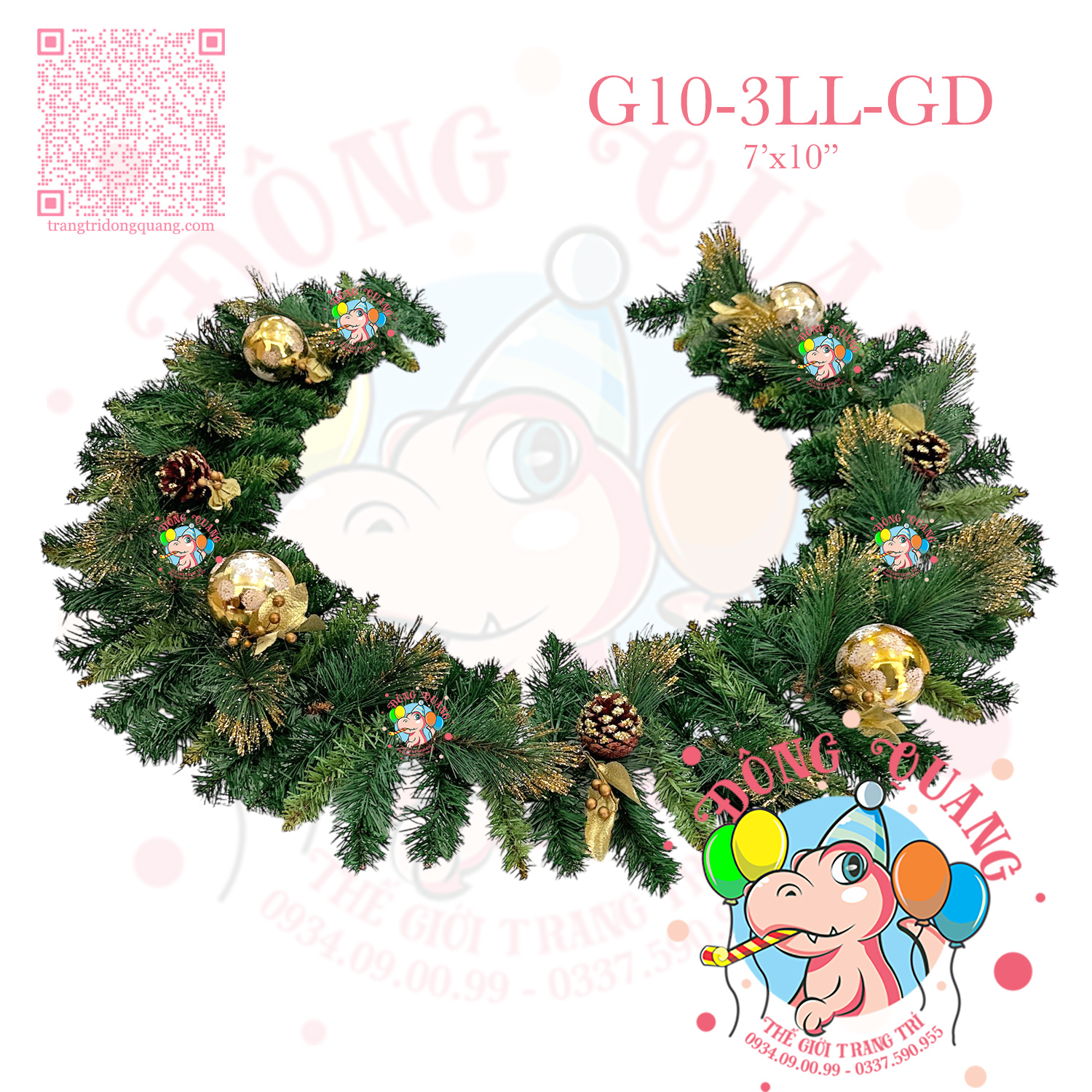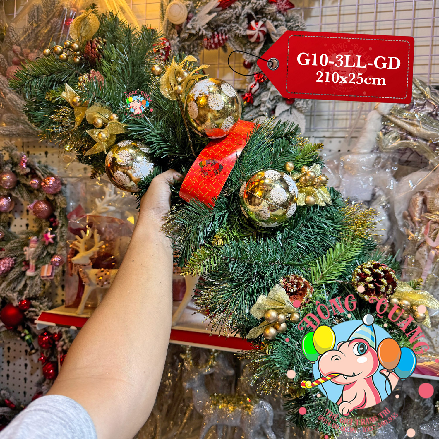- Chất liệu: 3 loại lá PVC, cước phun kim tuyến vàng, trái thông, trái châu, cherry.