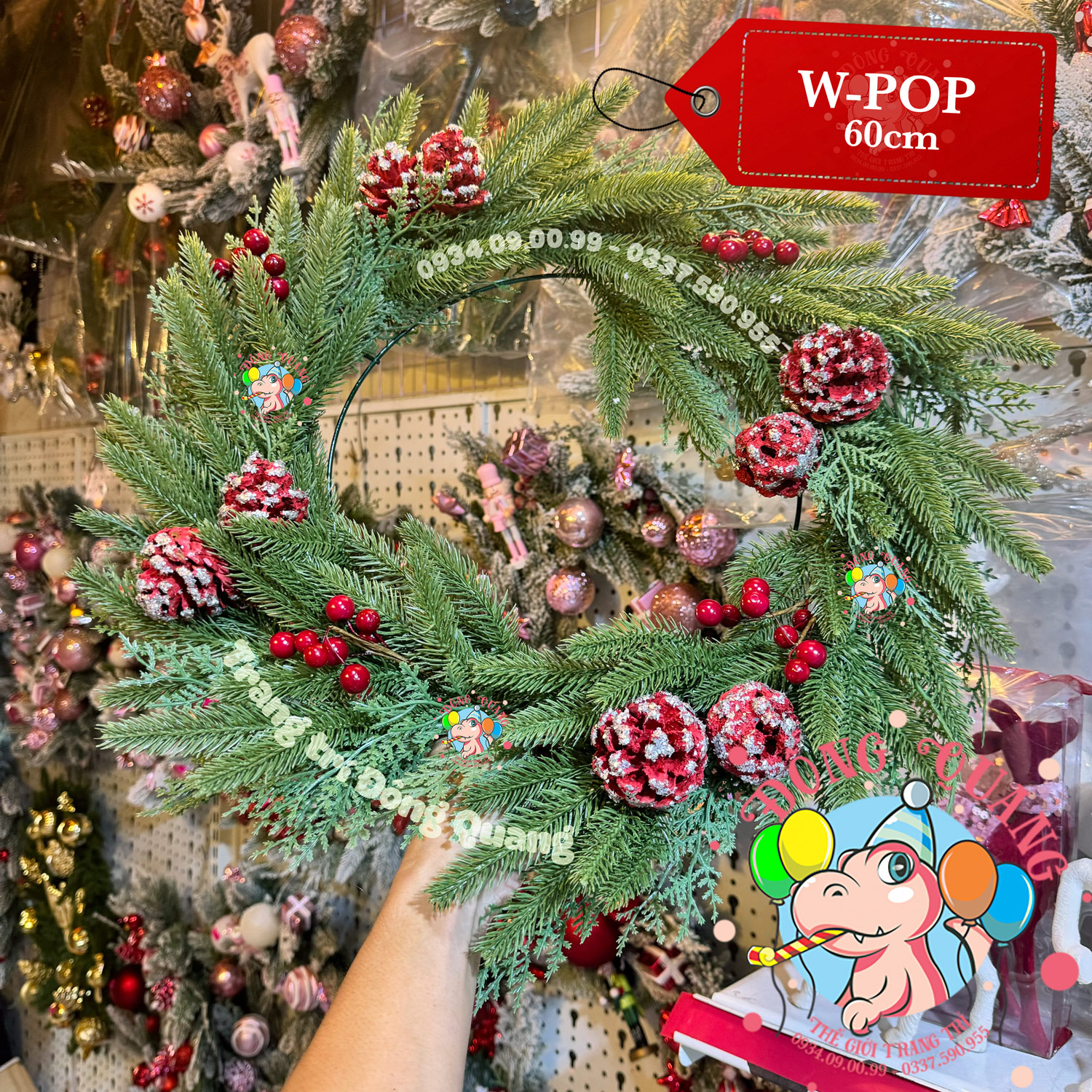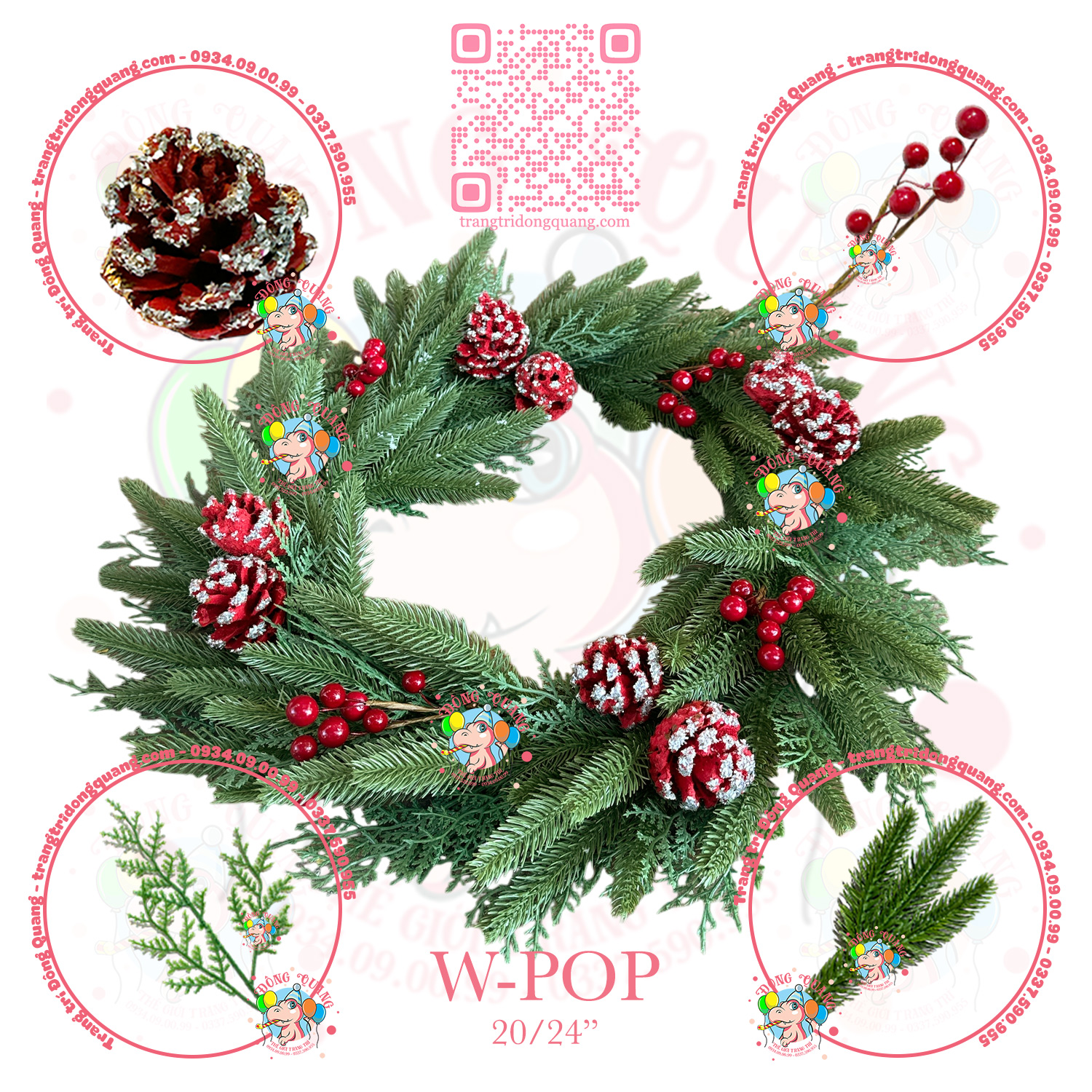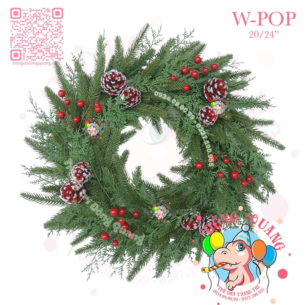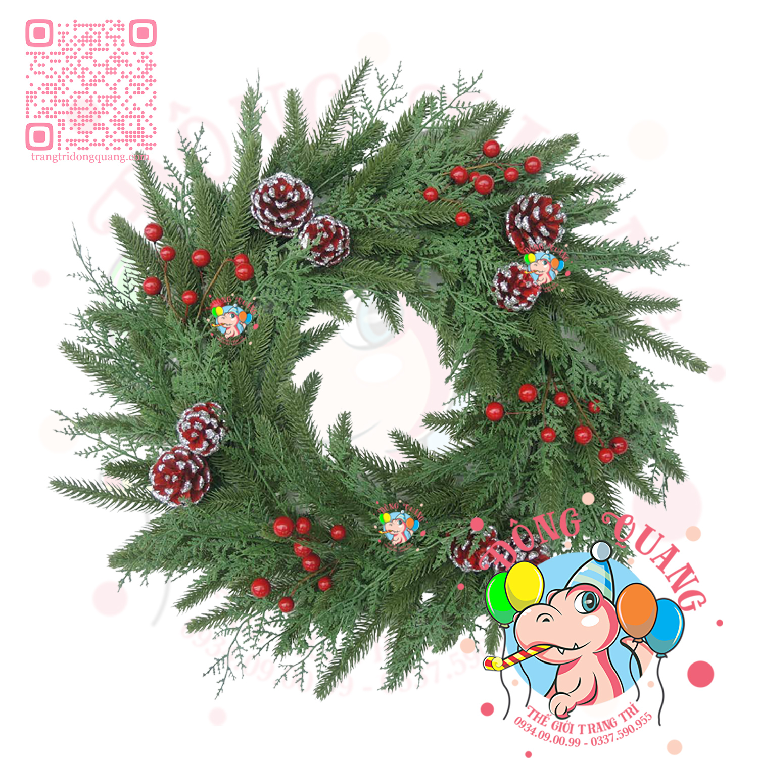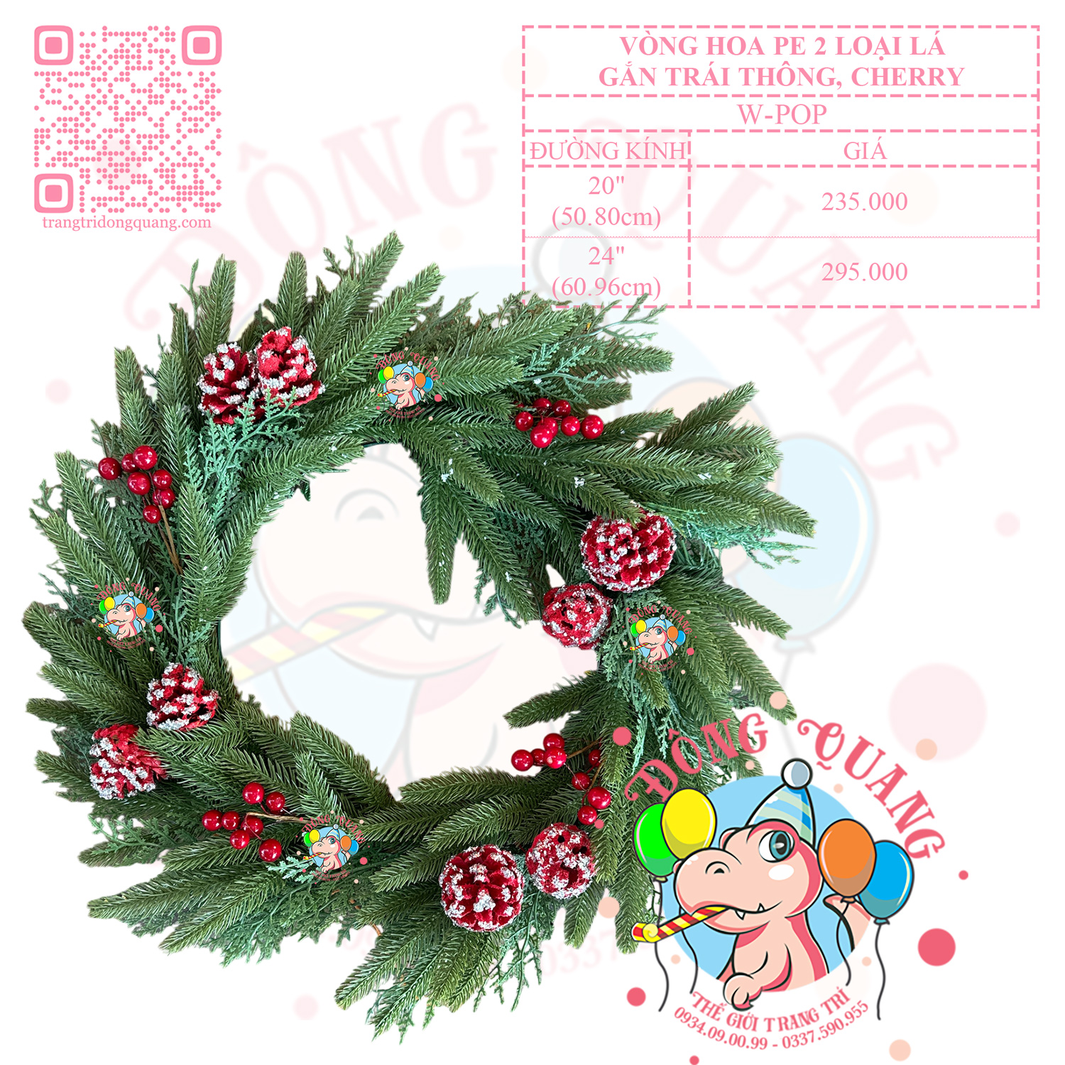 - Chất liệu: 2 loại lá PE cao cấp, trái thông, cherry.